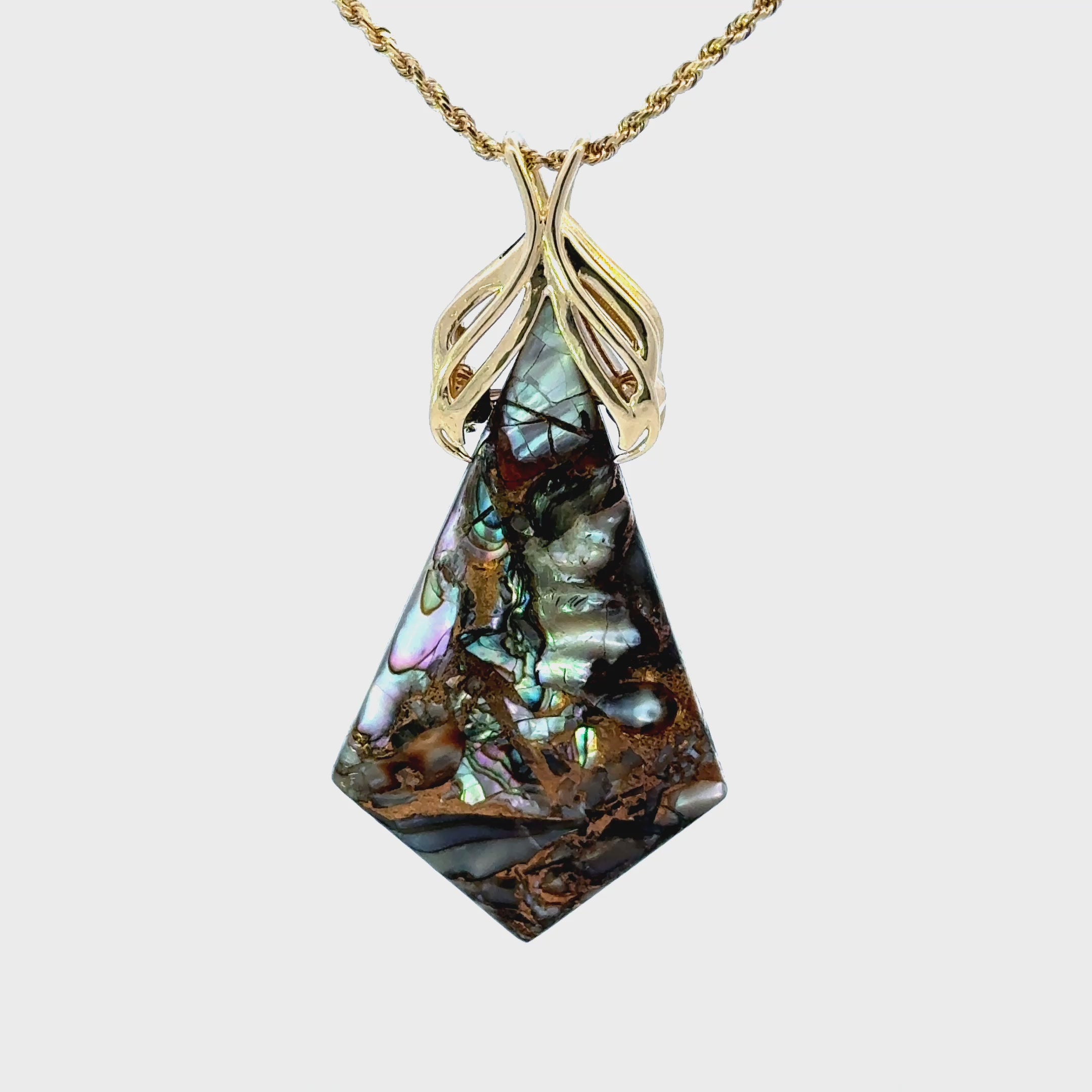 Embrace nature's artistry with this 14k yellow gold pendant, showcasing a mesmerizing abalone shell in a bold geometric cut. Swirling with iridescent hues and framed by an elegant, flowing gold design, it's a statement of organic beauty and refined craftsmanship  (matching earrings sold separately)